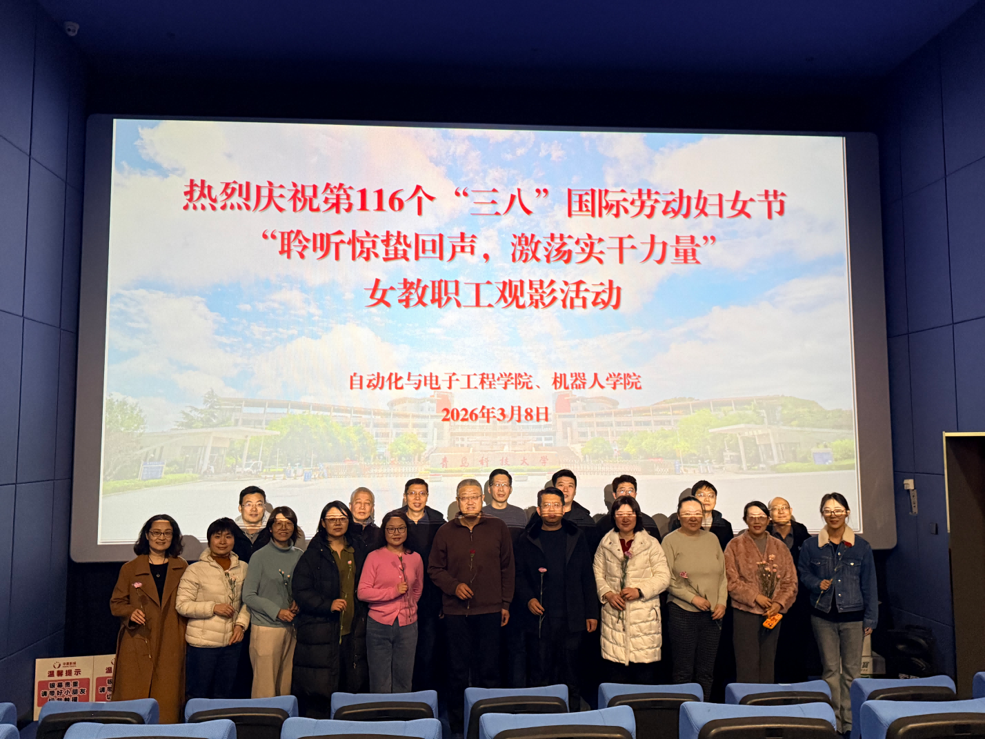 春回大地,万象更新。为庆祝第116个“三八”国际妇女节,丰富女教职工的精神文化生活,凝聚巾帼奋进力量,3月8日下午,自动化与电子工程学院联合机器人学院妇委会精心组织开展了“聆听惊蛰回声,激荡实干力量”主题观影活动。学院全体女教职工携家属共同参与了此次活动,在光影交织中度过了一个温馨而有意义的节日。